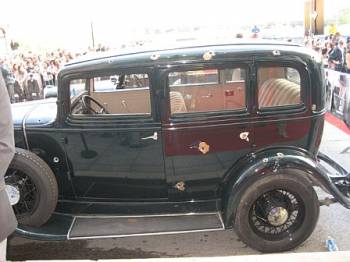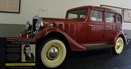 |  This is John Dillinger's 1933 Essex Terraplane 8 , that was caught up in a two car shoot-out in Chicago. The guy is pointing to a shotgun blast that was aimed at Mr. Dillinger while traveling down a Chicago street going 70 MPH or so. Wasn't a bank robbery, he was just spotted coming out of a Doctors office with his moll. |